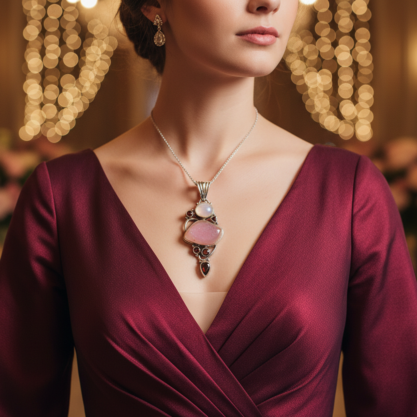 Colgante de plata esterlina con gran drusa de cuarzo rosa engastada en el centro con piedra lunar redonda y cinco piedras de granate más pequeñas.