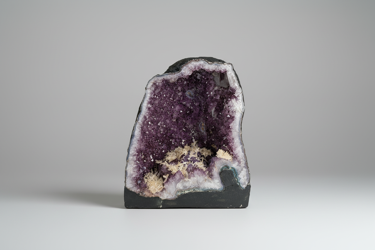 Discover the stunning beauty of this extraordinary amethyst geode. What sets this geode apart is the fascinating contrast between the vibrant amethyst and the delicate pale crystal clusters nestled within its base. These golden, almost flower-like formations add a unique visual element, providing a beautiful interplay between the vibrant purple tones and the lighter, intricate mineral structures. The layered textures and colors evoke a sense of mystery and wonder, making this geode a true masterpiece.