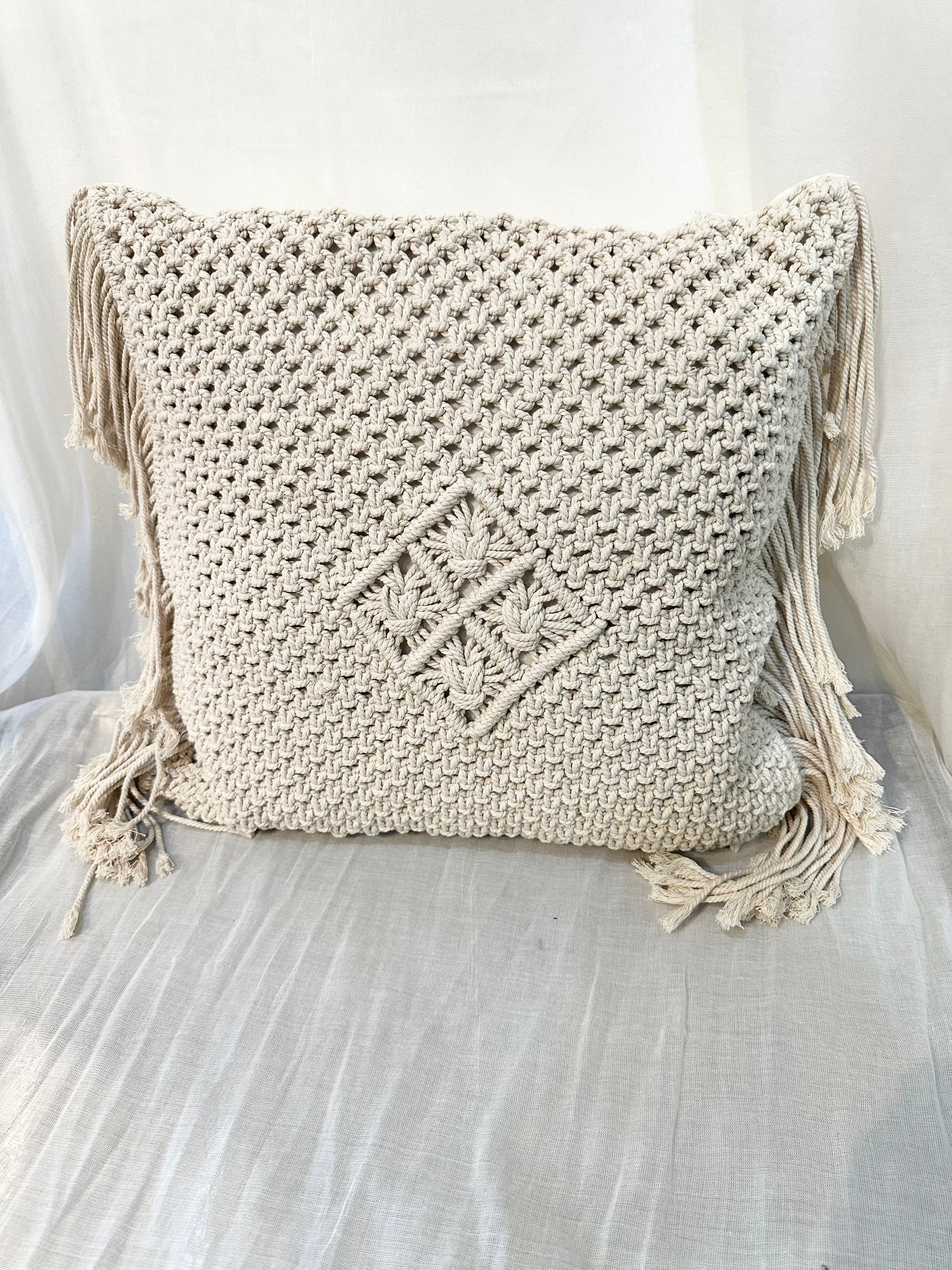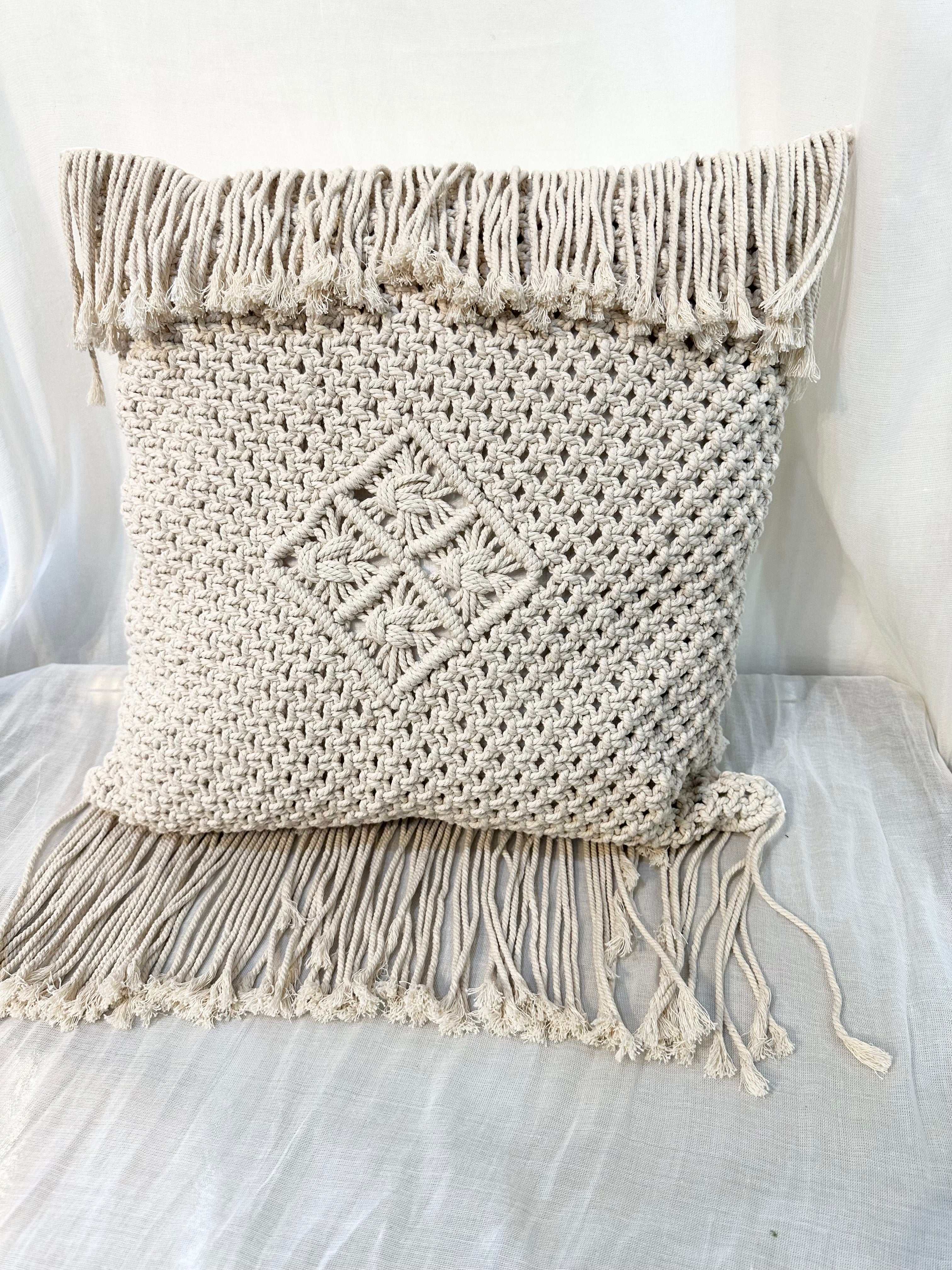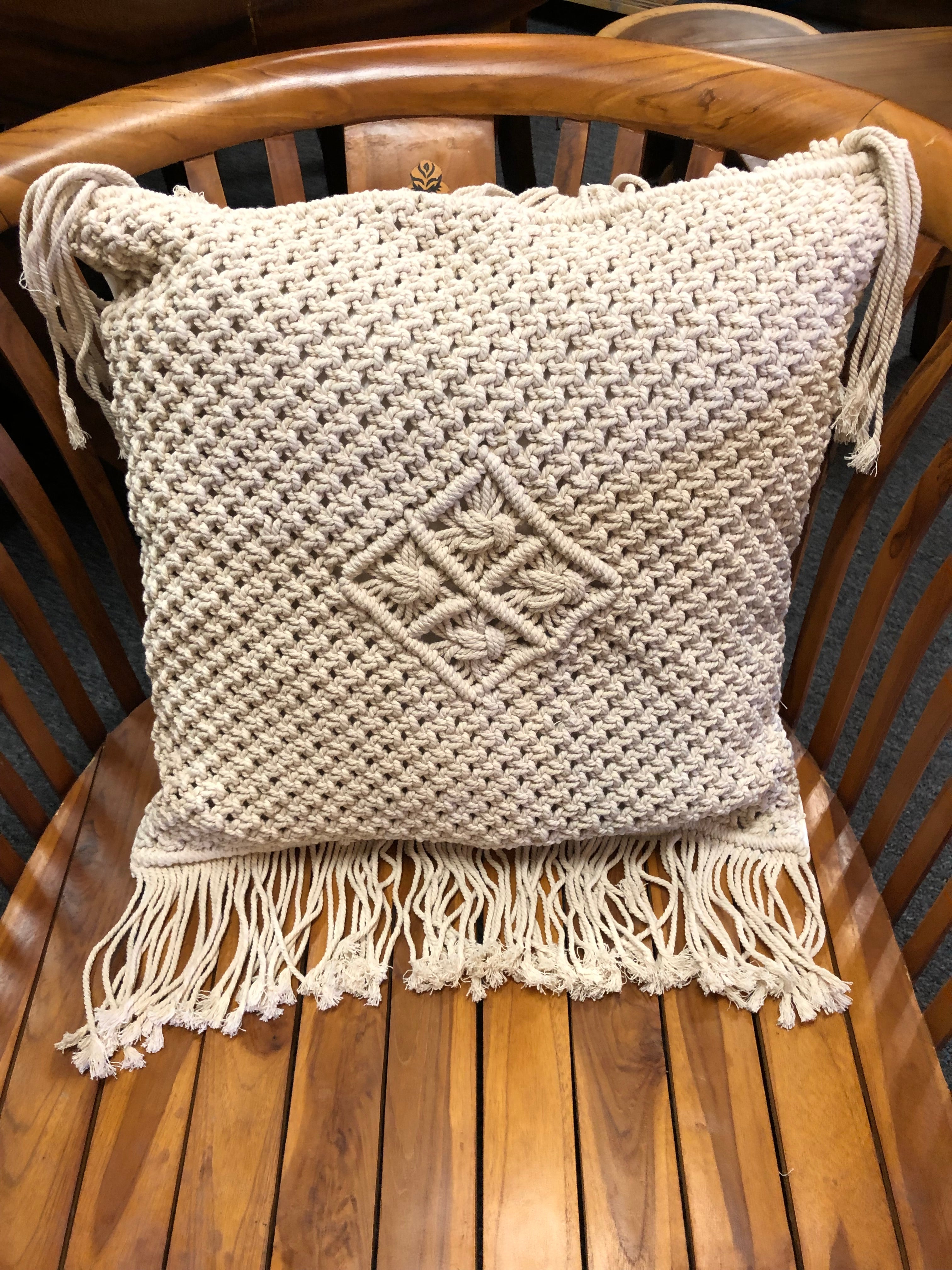 Hand Made Macramé Bohemian Style pillow, 20x20 stuffed pillow, Triangle design in center.