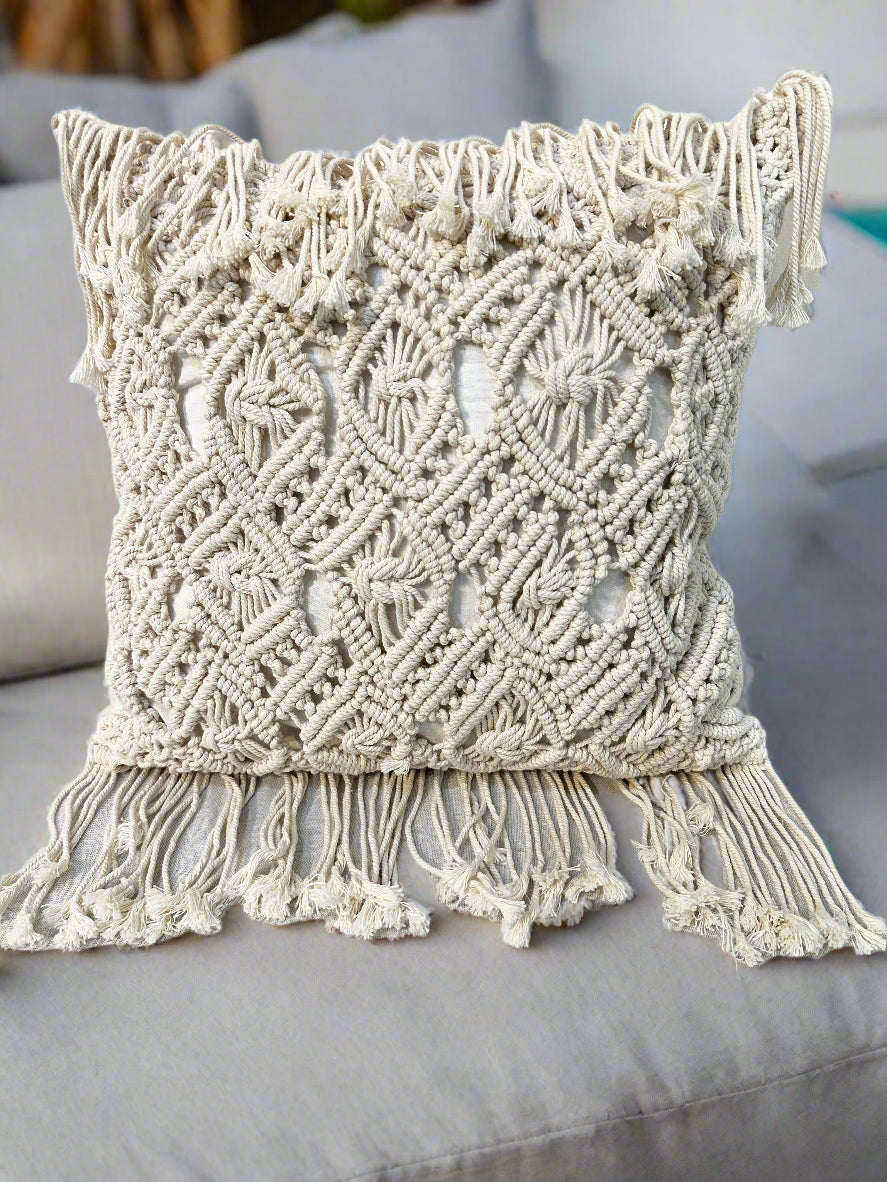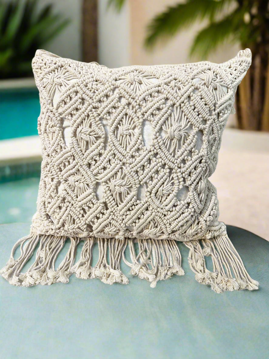 The Bohemian Macramé Throw Pillow features a neutral palette and exquisite hand-crafted detailing with an intricate design showcasing exceptional craftsmanship. Each set includes both the pillow cover and stuffing. Available sizes: Small 16"x16" (Item: 22604) and Large 20"x20" (Item: 22596).