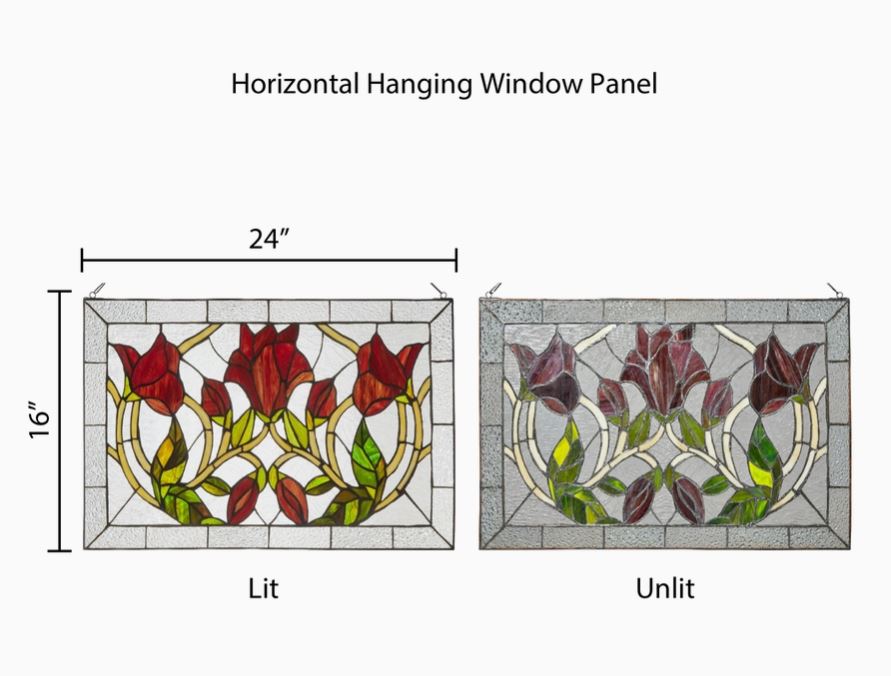 This exquisite stained glass floral vine remains perpetually vibrant, capturing the beauty of blooming flowers through 182 meticulously hand-cut pieces of Tiffany-style glass. Measuring 24 inches, the window panel radiates warmth as sunlight filters through its clear glass backdrop, highlighting the intricate red floral vine pattern with rich hues of red, green, and clear or blue, green, and clear. Ideal as a thoughtful gift for Mother's Day, anniversaries, or gardening enthusiasts, it hangs effortlessly with the included 32-inch metal chain. A refined accent for kitchen windows, bedrooms, or sunrooms—an elegant enhancement to your seasonal décor.