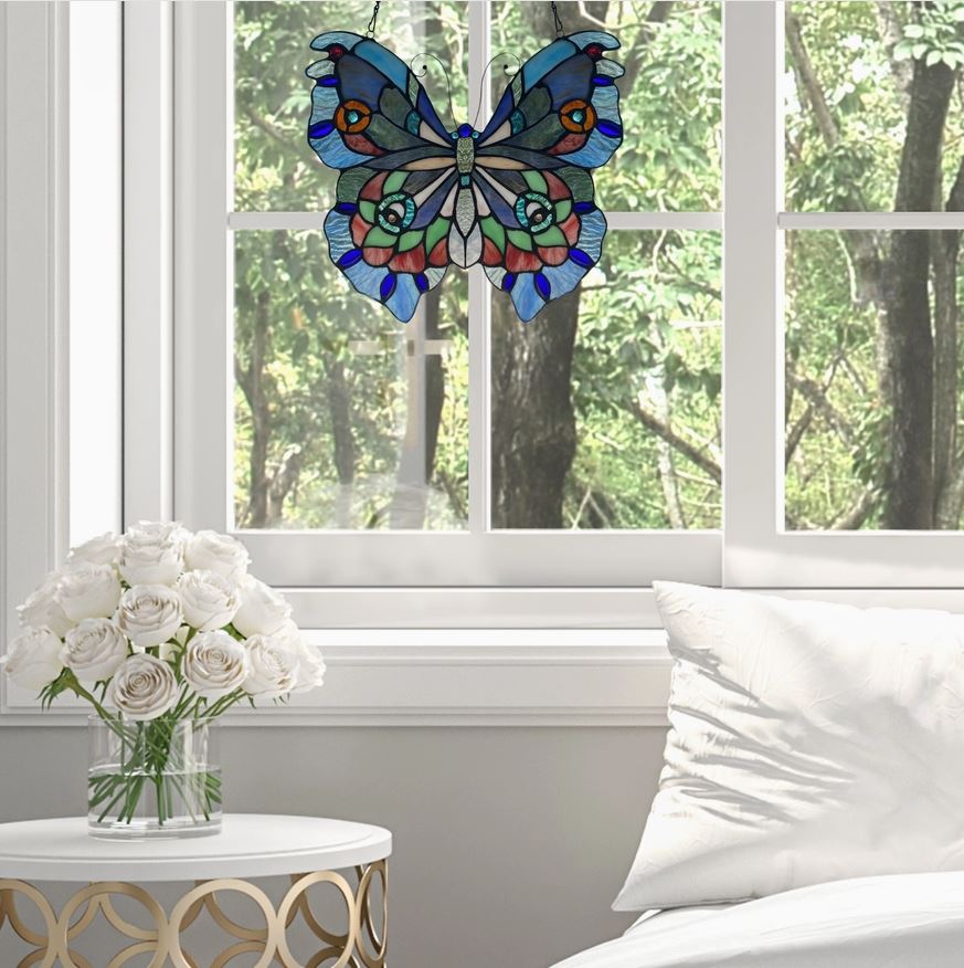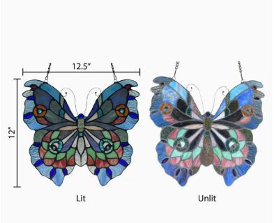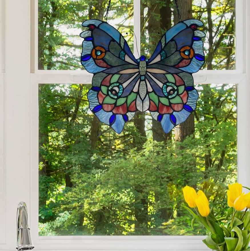 This butterfly window panel embodies life and resilience, featuring over 106 intricately cut stained glass pieces in soft purples, vivid blues, and textured clear and green hues. Created with the copper foil technique pioneered by Louis Comfort Tiffany, it combines various glass textures—including rippled and striated—to enhance depth and detail. Each panel includes a decorative hanging chain for secure installation, allowing you to easily bring a sense of calm and hope to your space. Dimensions: 12.5"L x 0.5"W x 12"H. Clean gently with a damp cloth or lemon oil polish, then dry thoroughly.
