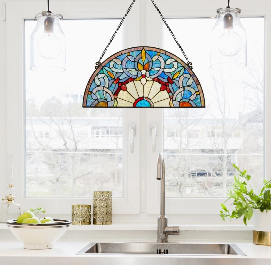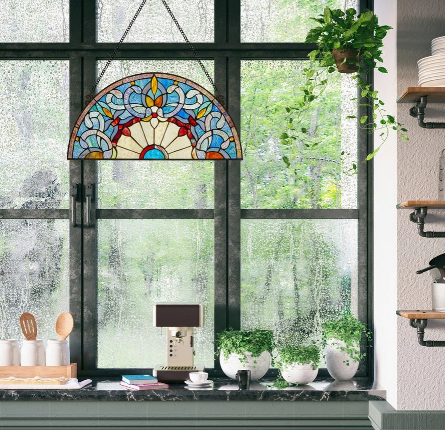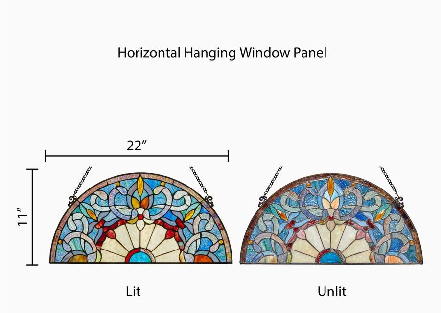 This exquisite Tiffany Style half-moon window panel is handcrafted using traditional techniques pioneered by Louis Comfort Tiffany. Measuring 22"L by 11"H, it features hand-cut glass and authentic glass cabochons in soothing sea blue, green, with subtle accents of red and plum. The combination of ripple, striated, mottled, and slate glass creates captivating depth and movement. Designed by Corista, this Victorian-inspired piece includes a decorative chain for elegant hanging. Perfect for casting a vibrant spectrum of light in any window or enhancing wall décor with timeless sophistication. Easy to maintain with a damp cloth or lemon oil polish.