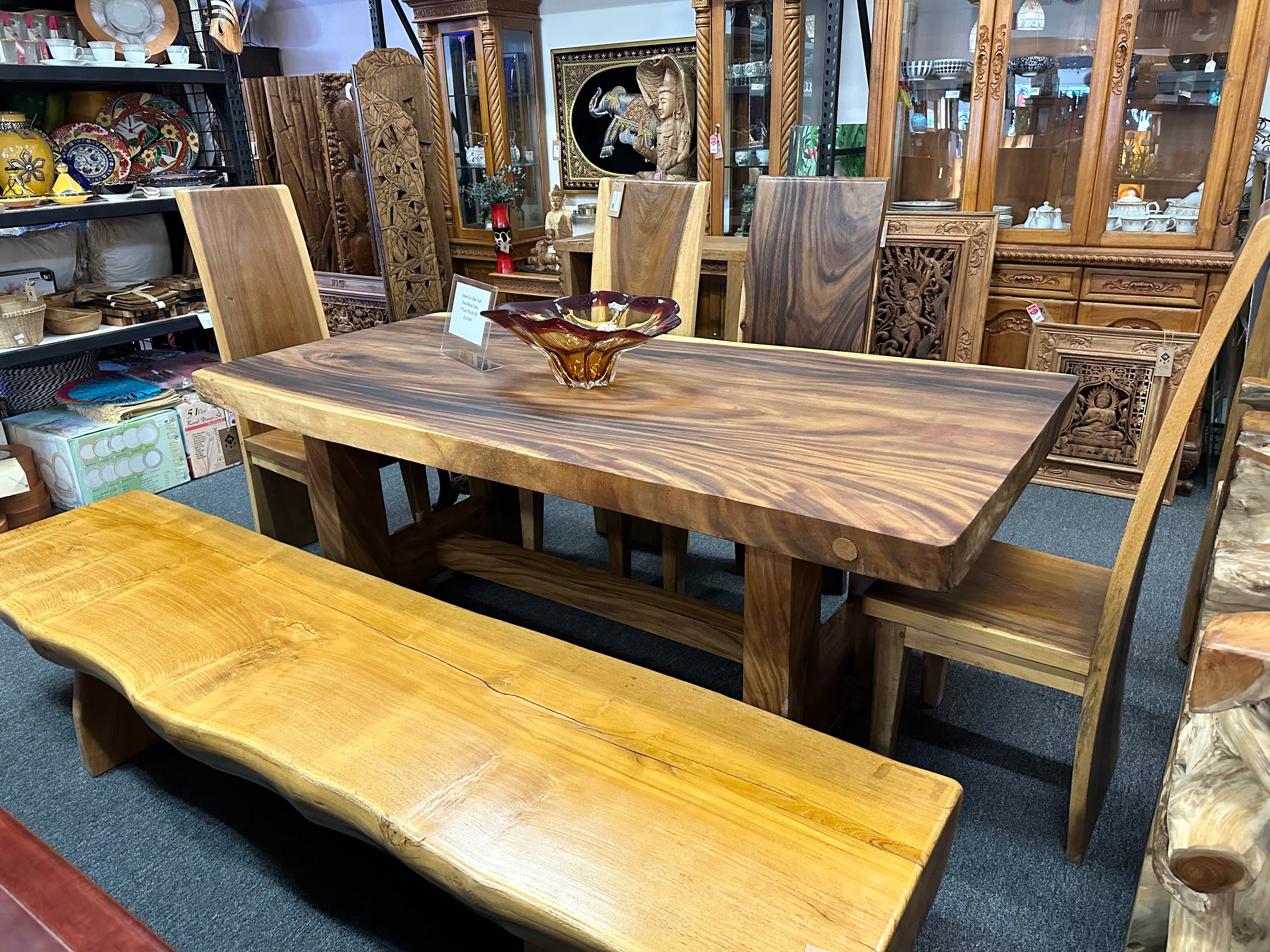 Teak Burl Wood live Edge Dining Table, Solid Wood Top and Bottom Legs, Chairs & Bench sold separately.